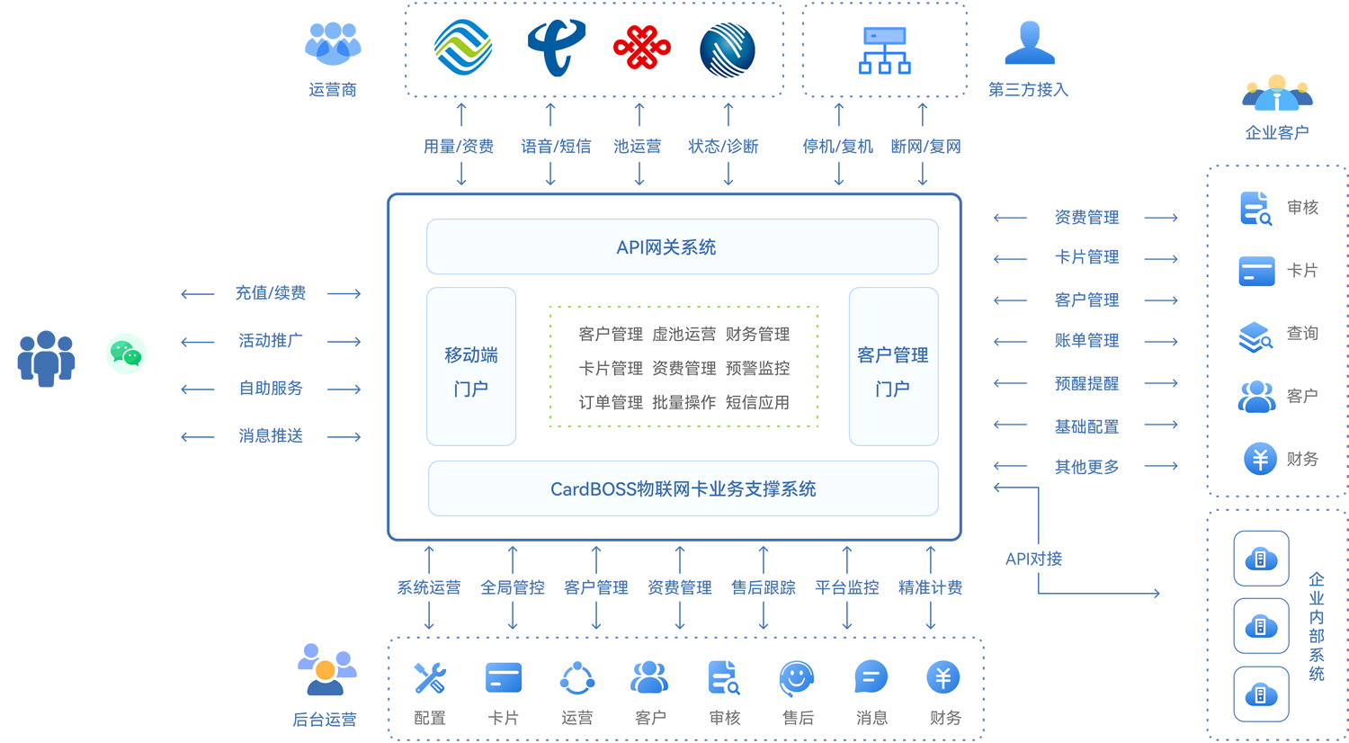 CardBOSS(Card Business & Operation Support System):物联网卡运营支撑系统是基于运营商的物联网卡业务,涵盖了物联网卡的日常业务管理、生命周期管理、流量套餐管理、流量池运营管理、以及计费结算管理等功能,并对物联网卡的各种业务功能进行集中、统一的规划和整合。为智能硬件应用企业的移动物联通信提供一站式卓有成效的解决方案,同时支持多应用场景适配以及强大的数据统计分析与预警能力。CardBOSS系统与运营商BOSS系统深度融合,优势互补,实现了功能上的全面对接,令客户能够享受到更高效的业务处理、更便捷的数据收集和更精准的运营服务。